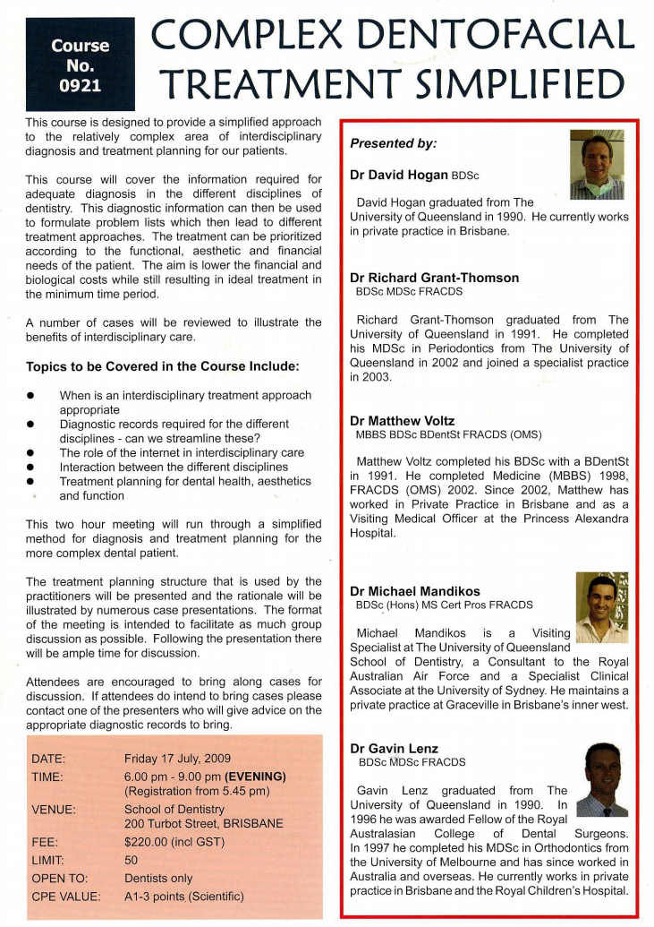 Presented by Dr Michael Mandikos, Dr David Hogan, Dr Richard Grant-Thomson, Dr Matthew Voltz, Dr Gavin Lenz.