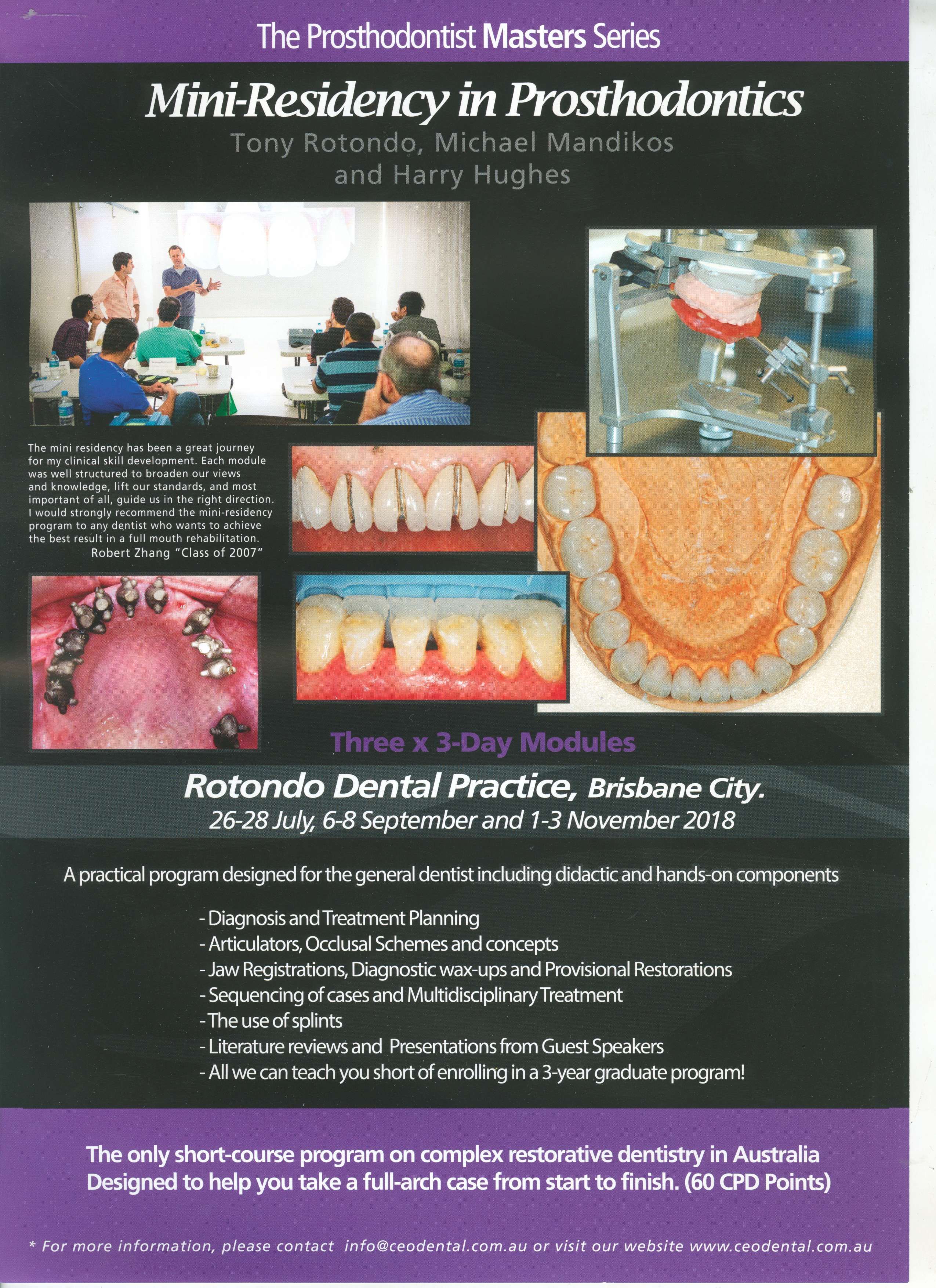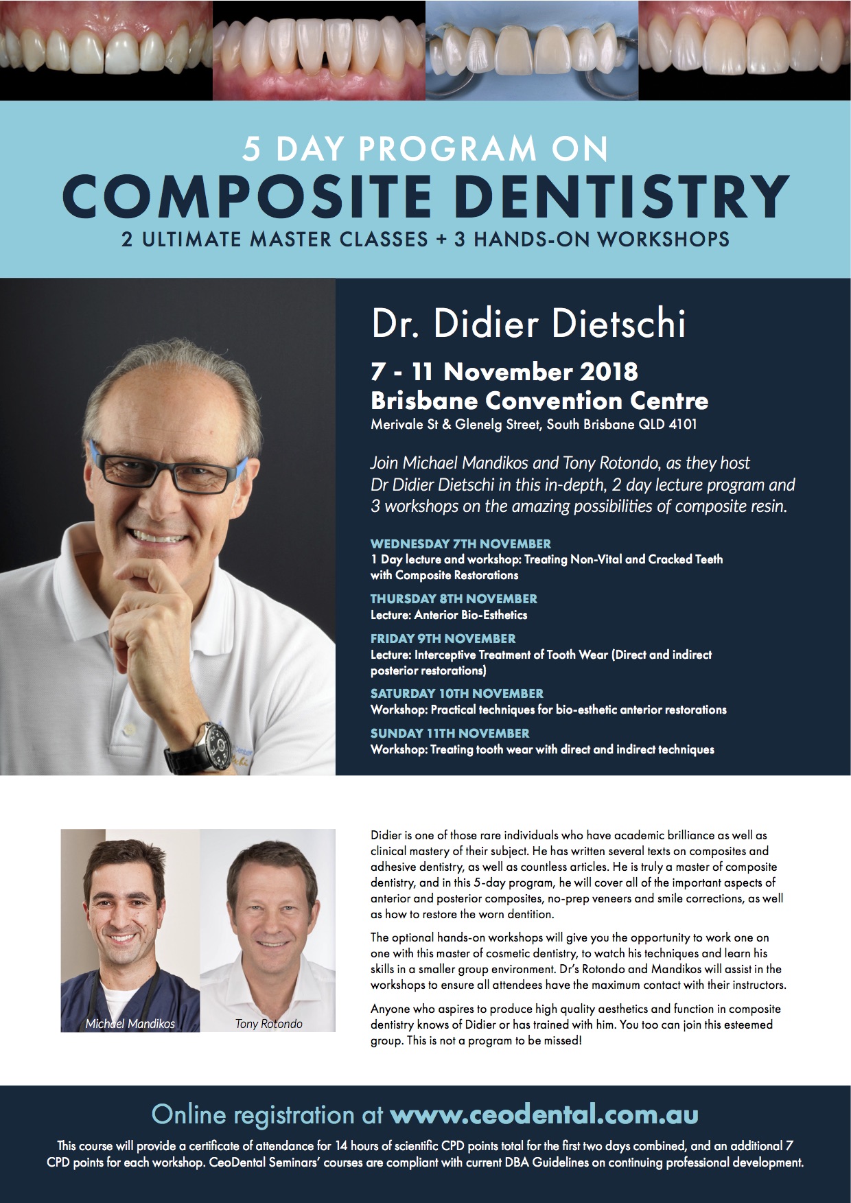 Join Michael Mandikos and Tony Rotondo, as they host Dr Didier Dietschi in this in-depth, 2 day lecture program and 3 workshops on the amazing possibilities of composite resin.