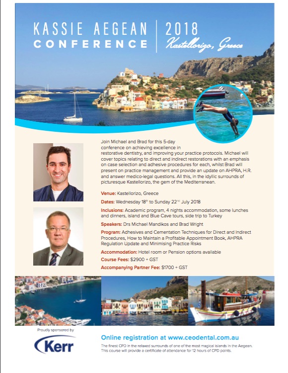 Join Michael and Brad for this 5 day conference on achieving excellence in restorative dentistry, and improving your practice protocols. Michael will cover topics relating to direct and indirect restorations with an emphasis on case selection and adhesive procedures for each, whilst Brad will present on practice management and provide an update on AHPRA, H.R. and answer medico-legal questions. All this, in the idyllic surrounds of picturesque Kastellorizo, the gem of the Mediterranean.