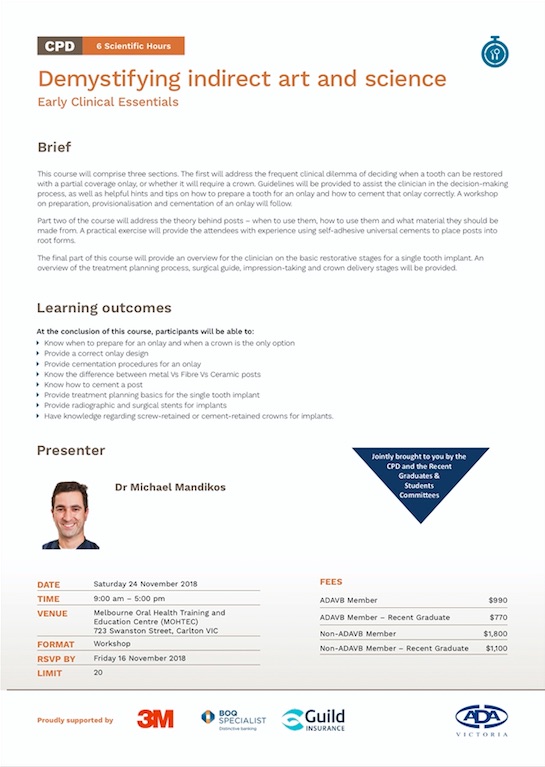 This course will comprise three sections. The first will address the frequent clinical dilemma of deciding when a tooth can be restored with a partial coverage onlay, or whether it will require a crown. Guidelines will be provided to assist the clinician in the decision-making process, as well as helpful hints and tips on how to prepare a tooth for an onlay and how to cement that onlay correctly. A workshop on preparation, provisionalisation and cementation of an onlay will follow.