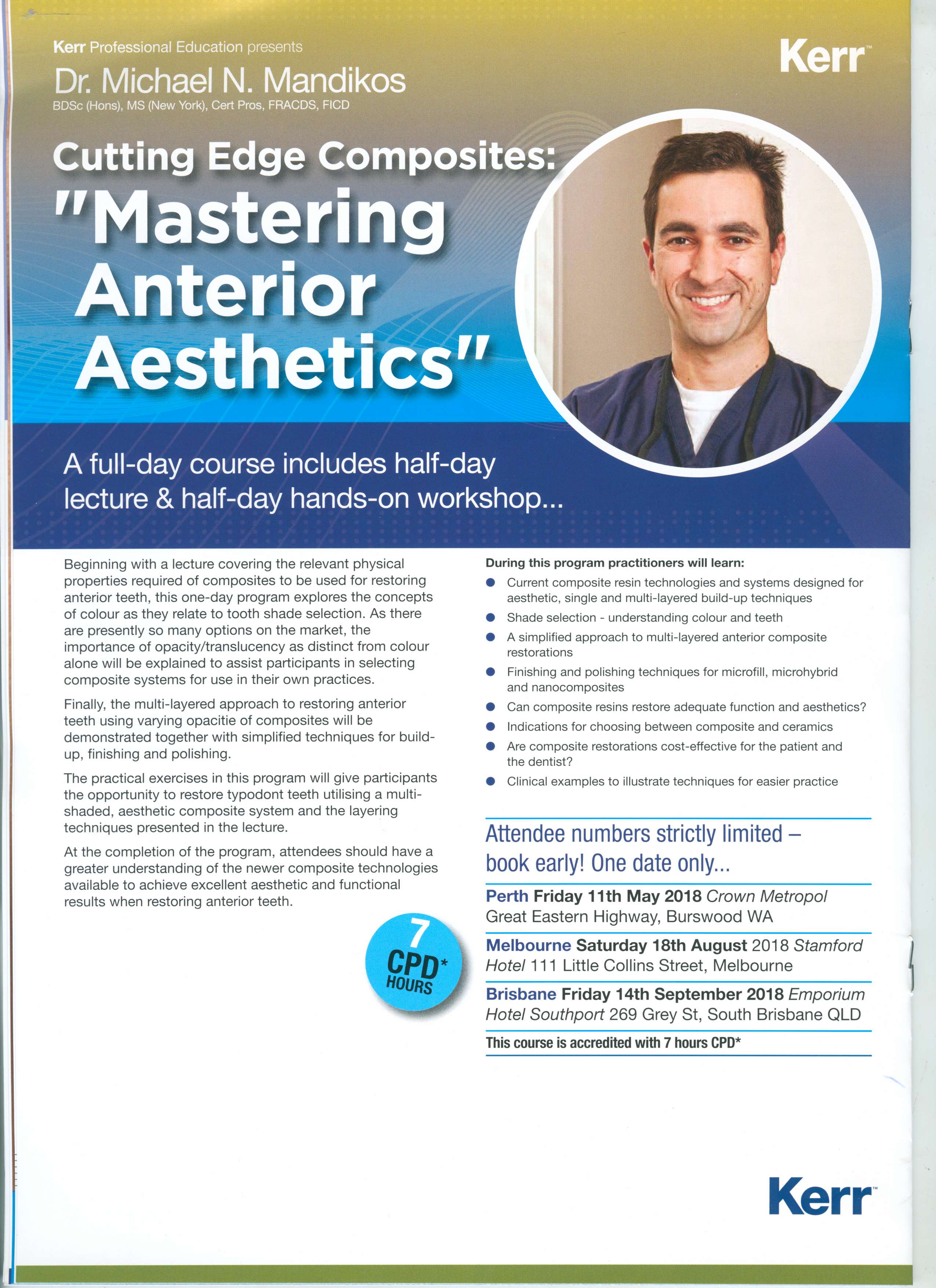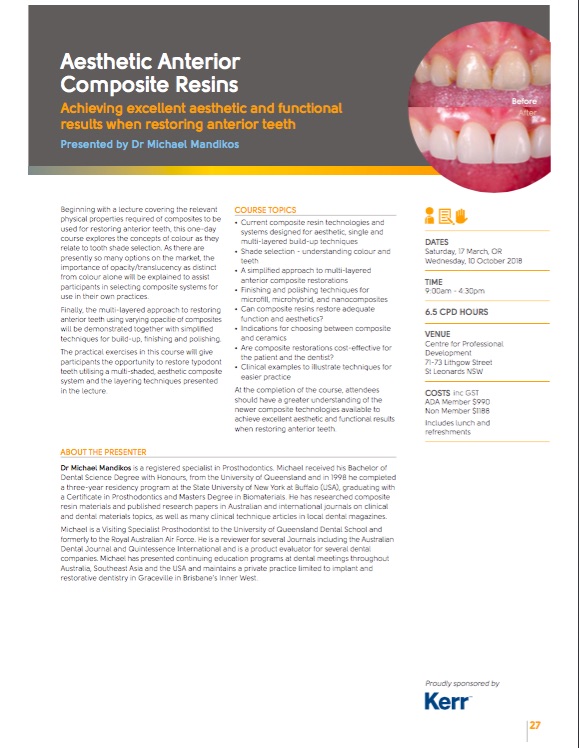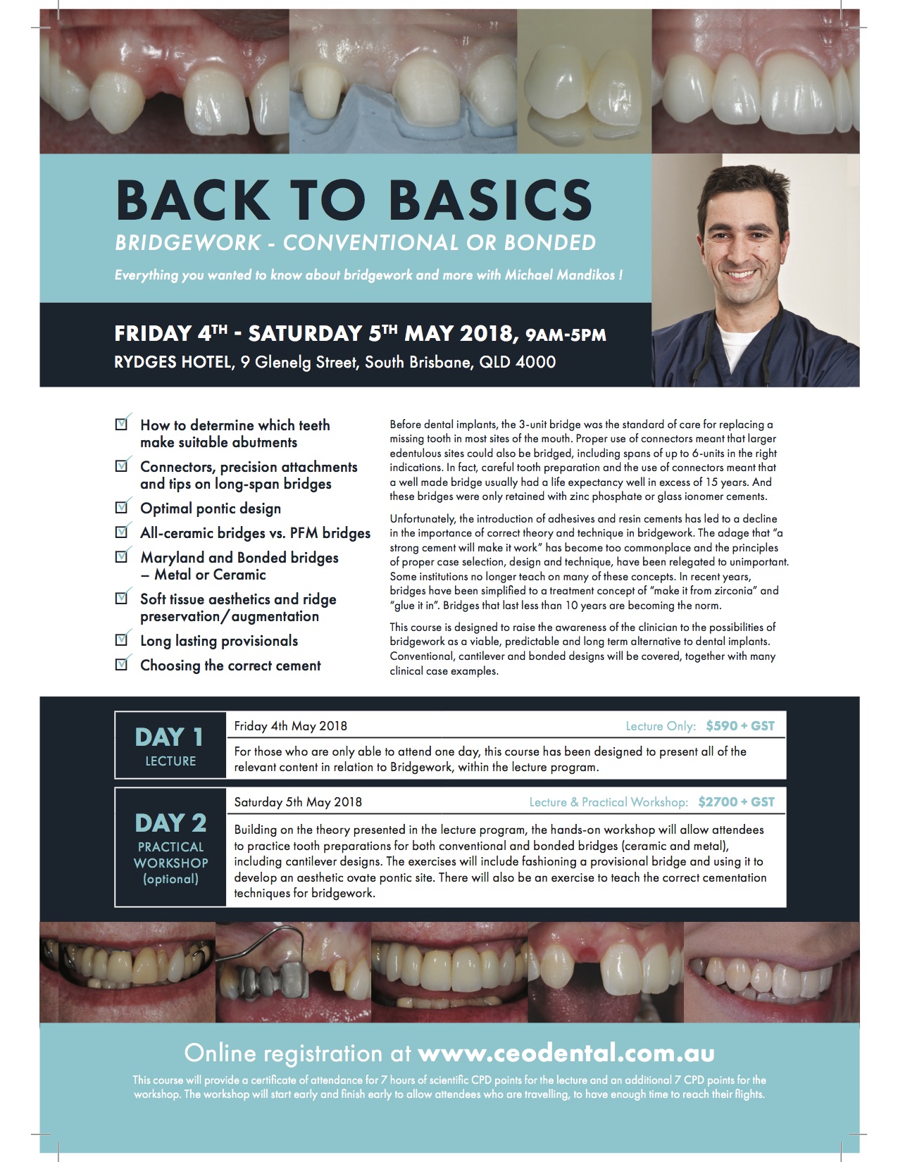 This course is designed to raise the awareness of the clinician to the possibilities of bridgework as a viable, predictable and long-term alternative to dental implants. Conventional, cantilever and bonded designs will be covered, together with many clinical case examples.