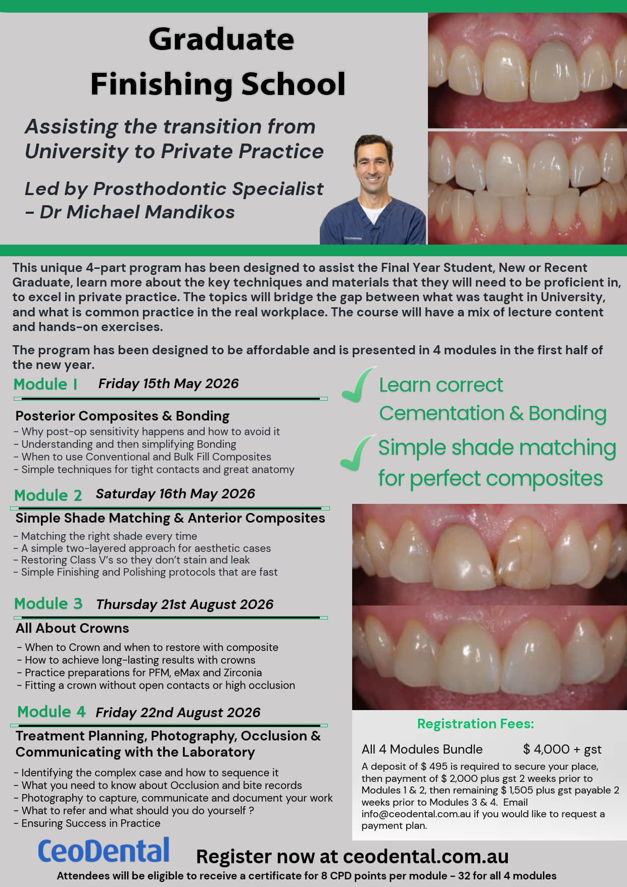 This unique 4 part program has been designed to assist Final Year Students as well as new and recent graduates. Learn more about the four key techniques and materials that they will need to be proficient in to excel in private practice.